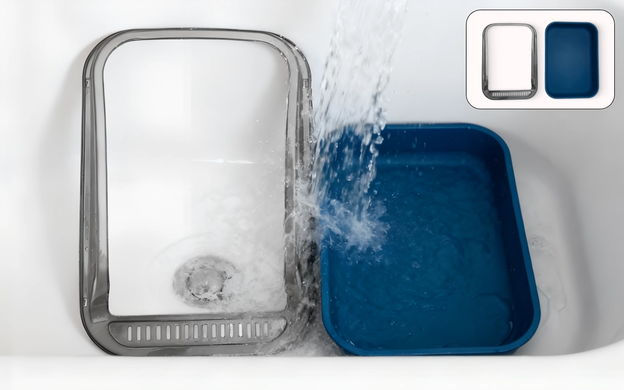 Hohe Seitenwände und clevere Barrieren halten das Streu immer drinnen. Die Böden bleiben makellos, sodass die Reinigung schnell und einfach erscheint.