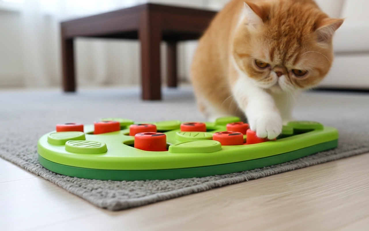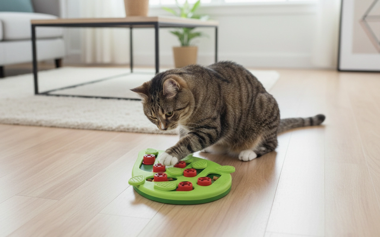 Das Futter-Puzzle macht das Abendessen für unsere Katze aufregender.