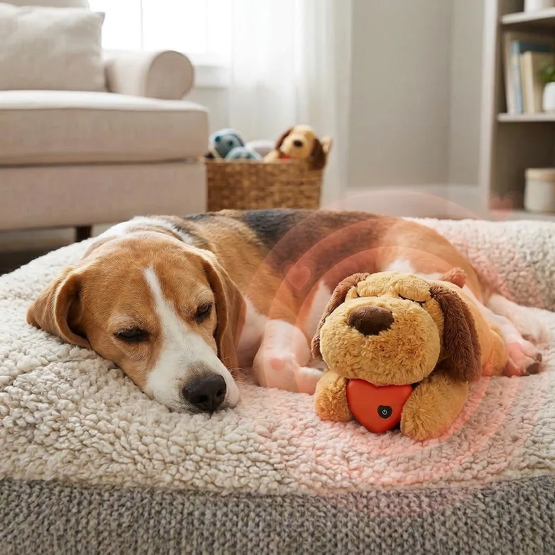 Mein Welpe liebt es, mit dem Herzschlag-Plüschtier zu kuscheln.