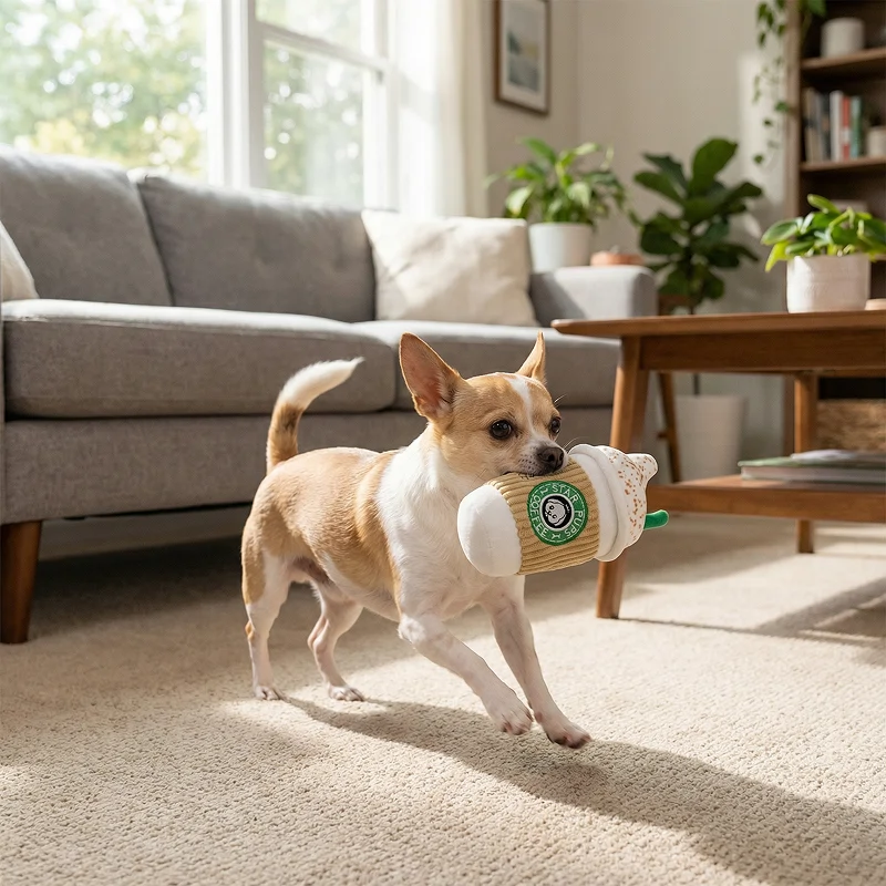 Verspielte Welpen genießen stundenlang den Primdog Coffee Cap. Der weiche Fleece fühlt sich jedes Mal sanft an Zähnen und Zahnfleisch an. Helle Farben und lustiges Quietschen ziehen sofort die Aufmerksamkeit auf sich. Strapazierfähige Nähte sorgen dafür, dass das Spielzeug viele energiegeladene Spiele übersteht.