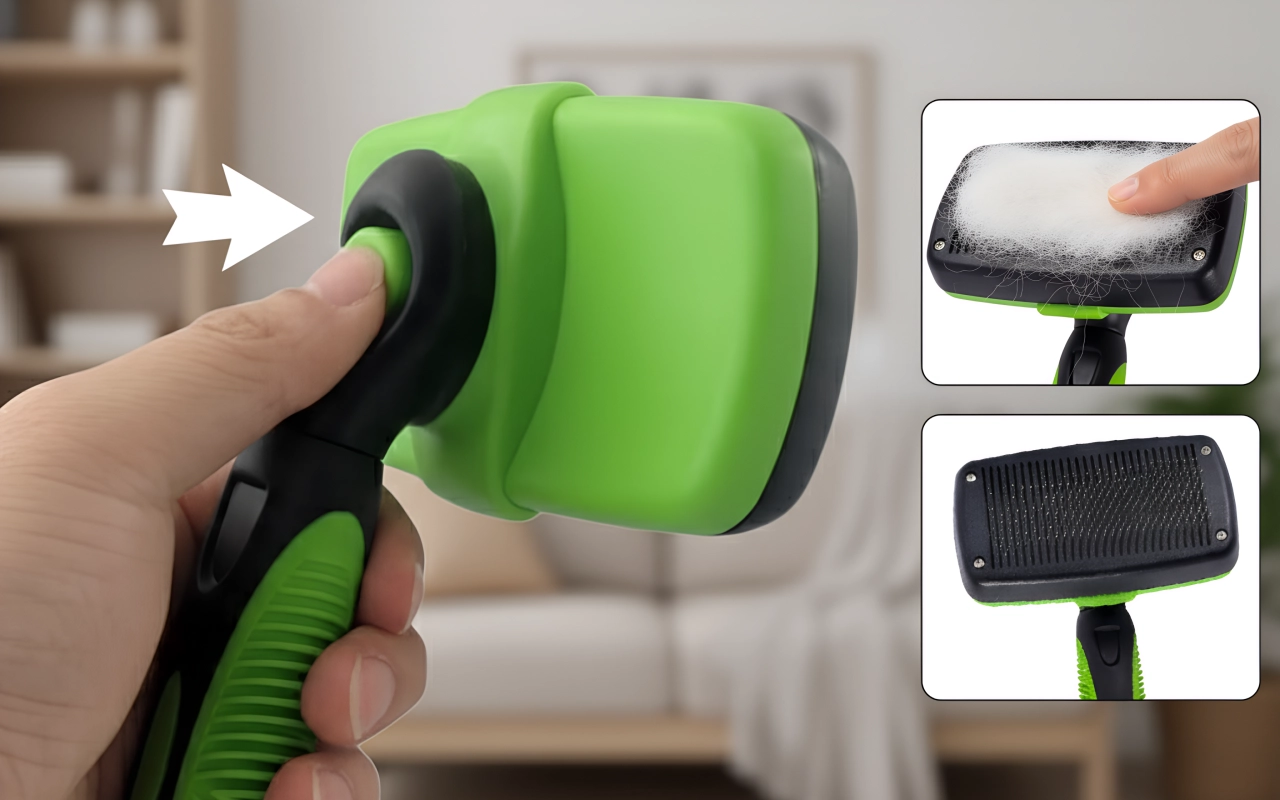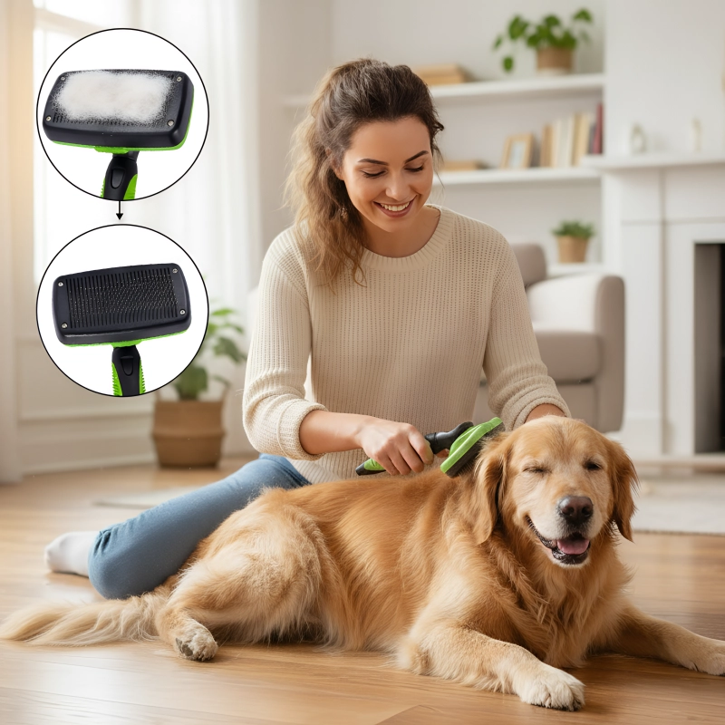 Mein Pudel hasst die meisten Bürsten, aber diese ist sanft genug. Die Ein-Klick-Reinigung ist super – einfach zu bedienen und zieht nicht am Fell.