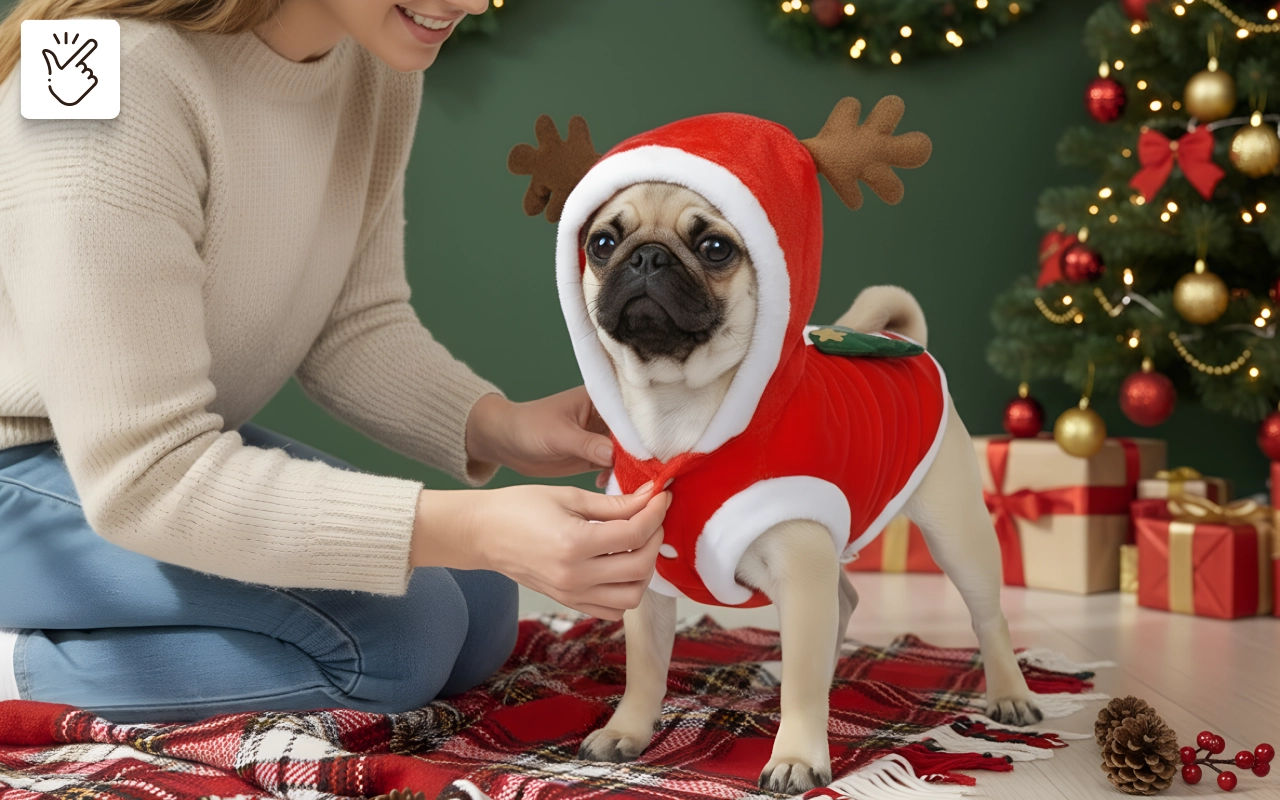 Habe diesen Rentieranzug für meinen Welpen besorgt, und er wollte ihn gar nicht mehr ausziehen. Er lässt sich dank der cleveren Schnalle leicht anziehen. Die Leute bleiben stehen und sagen, wie süß er aussieht!