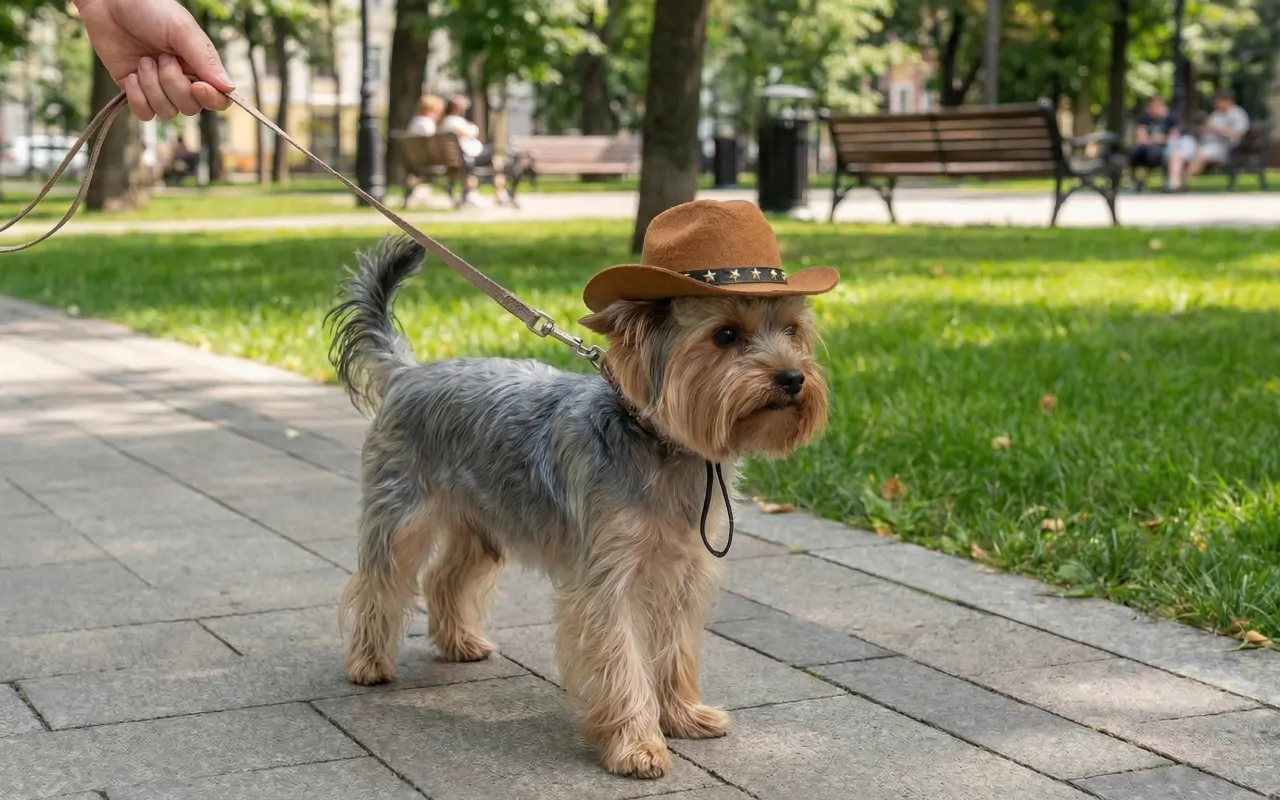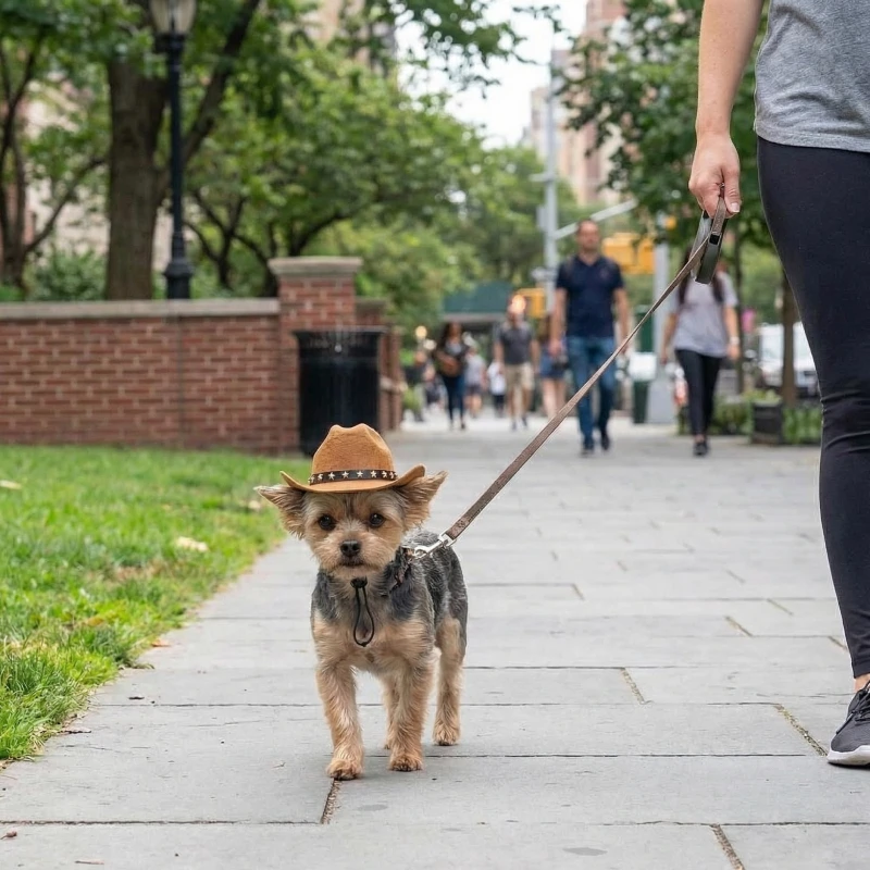 Ich gehe jeden Morgen mit meinem Hund in der Innenstadt spazieren. Mit diesem Hut erinnern sich die Baristas an seinen Namen, und er wirkt besonders selbstbewusst, wenn er den Bürgersteig entlangtrippelt.