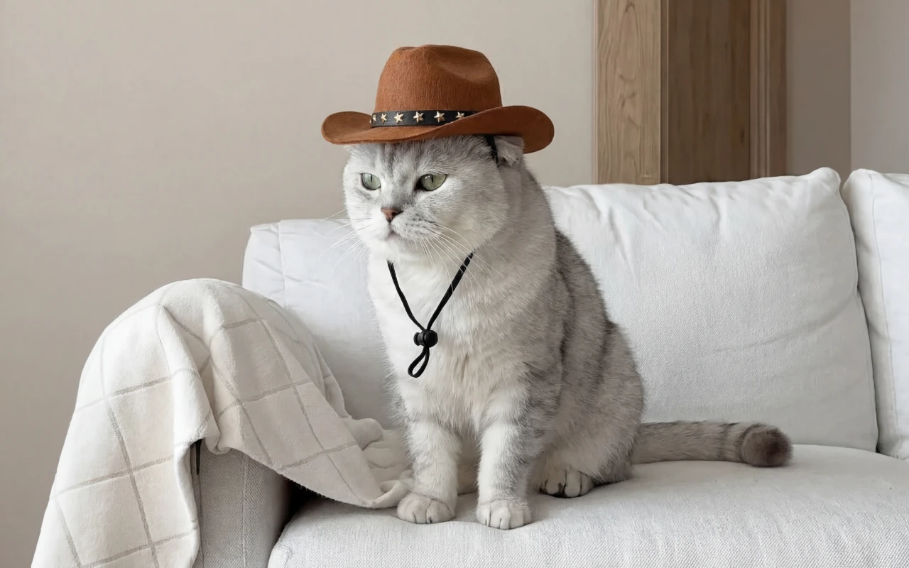 Ich habe den Hut als Scherz für meine Katze bestellt, aber es wurde zu einer täglichen Sache. Sie liegt damit auf dem Sofa und sieht aus wie eine winzige Sheriff.