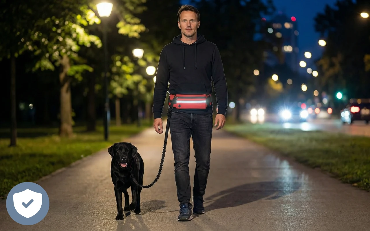 Super für Spaziergänge nach dem Abendessen. Das Band reflektiert im Scheinwerferlicht und meine Sachen sind sicher in der Bauchtasche.