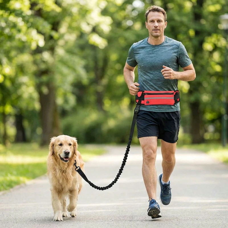 Genießen Sie Sport oder Spaziergänge ohne Aufwand oder verheddertes Zubehör. Der Primdog-Leinenhalter hält Ihr Haustier in der Nähe, während Sie sich frei bewegen können. Bewahren Sie Ihre wichtigsten Utensilien während des Ausflugs sicher in der robusten Bauchtasche auf.