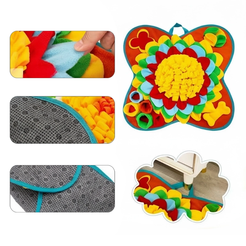 Das Aufspüren von Futter, das in der Matte versteckt ist, schärft die Konzentration Ihres Tieres. Regelmäßiges Spielen hilft, Stress abzubauen und ängstliches Verhalten zu vermeiden.