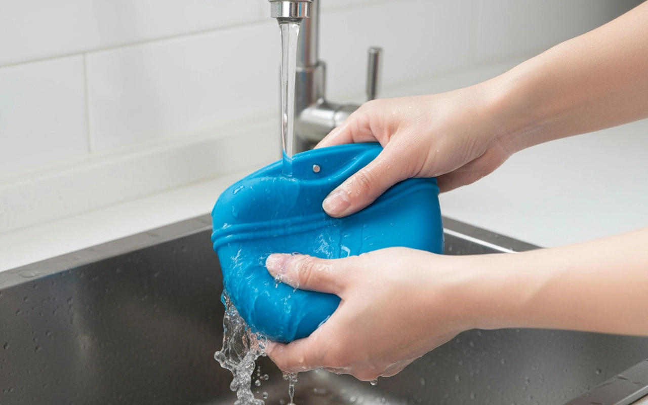 Das Waschen dauert nur Sekunden, sodass die Tasche frisch und hygienisch bleibt. Das Silikon lässt sich zum gründlichen Ausspülen komplett umkrempeln.