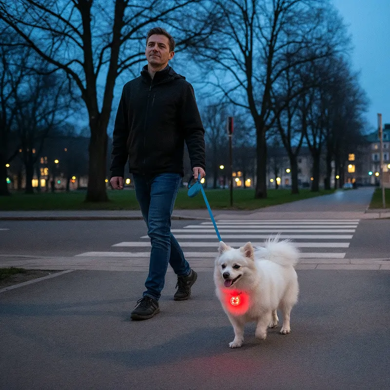 Der Halsbandanhänger war einfach anzubringen und seitdem ist jeder Spaziergang bei Sonnenuntergang stressfrei. Das Licht ist hell, aber nicht störend.