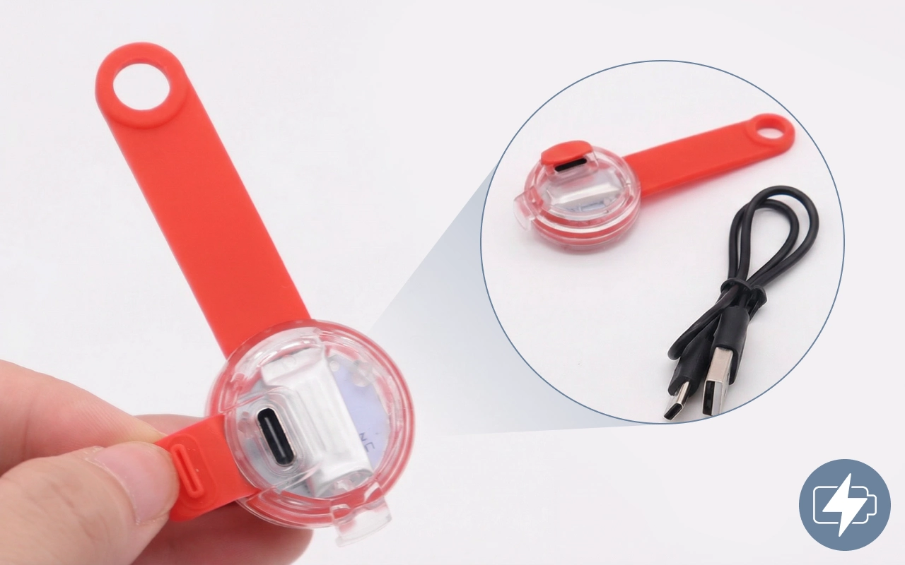 Lässt sich einfach mit meinem Handyladekabel laden. Ich fühle mich besser, wenn wir abends an belebten Straßen spazieren.