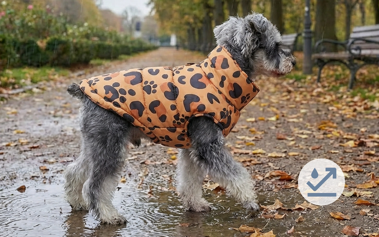 Spritzer rollen von der Oberfläche ab und halten das Fell trocken und gemütlich. Spaziergänge bleiben auch dann angenehm, wenn plötzlich Pfützen oder Regenschauer auftauchen.