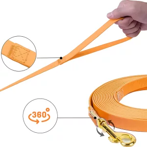 Die wasserdichte Primdog-Leine kommt problemlos mit der Bewegung aktiver Hunde zurecht. Sie ist wetterfest und hält allen Bedingungen stand. Außerdem kann sie schnell mit einem feuchten Tuch abgewischt werden.