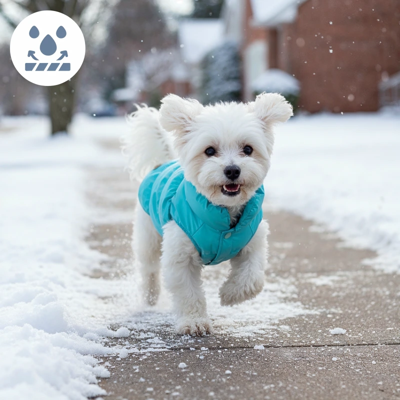 Der Mantel ist leicht, sodass mein Hund springen und rennen kann, so viel er will! Die Wasserfestigkeit funktioniert wirklich. Ich bin so froh, dass ich das für unsere Winterspaziergänge gefunden habe.